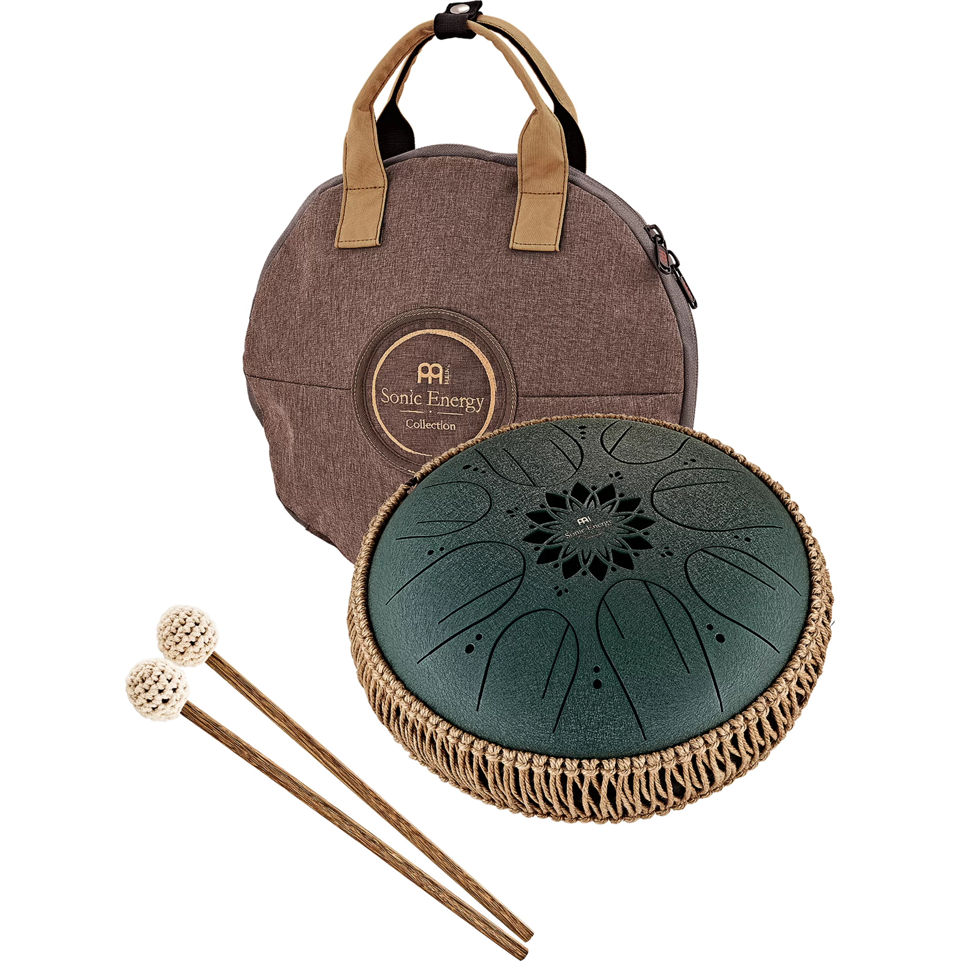 The Meinl Sonic Energy 10" Medium Octave Steel Tongue Drum is made of high-quality stainless steel. Its eight-octavated notes deliver the tones in two octaves. This creates a wonderful, meditative sound similar to the tone of a handpan. A sound hole located at the bottom of the drum can be sealed with a silicon plug to provide an even more compact sound. Three silicone feet at the bottom keep the drum from slipping. The Medium Octave Steel Tongue Drum can be played with your fingers or mallets. To begin playing, simply place it on a flat surface or your lap. The drum comes with two wooden mallets with soft-wrapped rubber heads, and a nice carrying bag with zipper and handle.