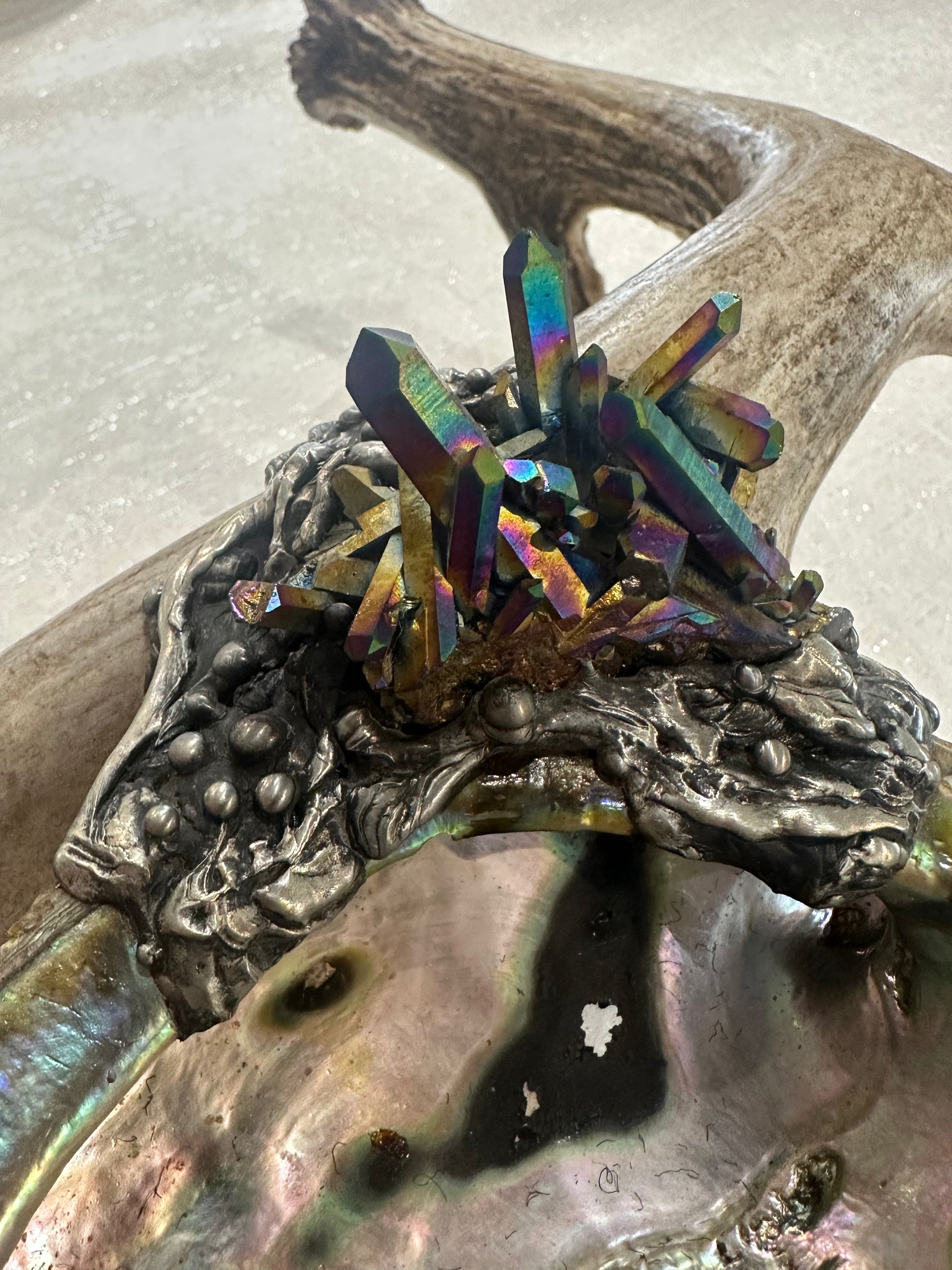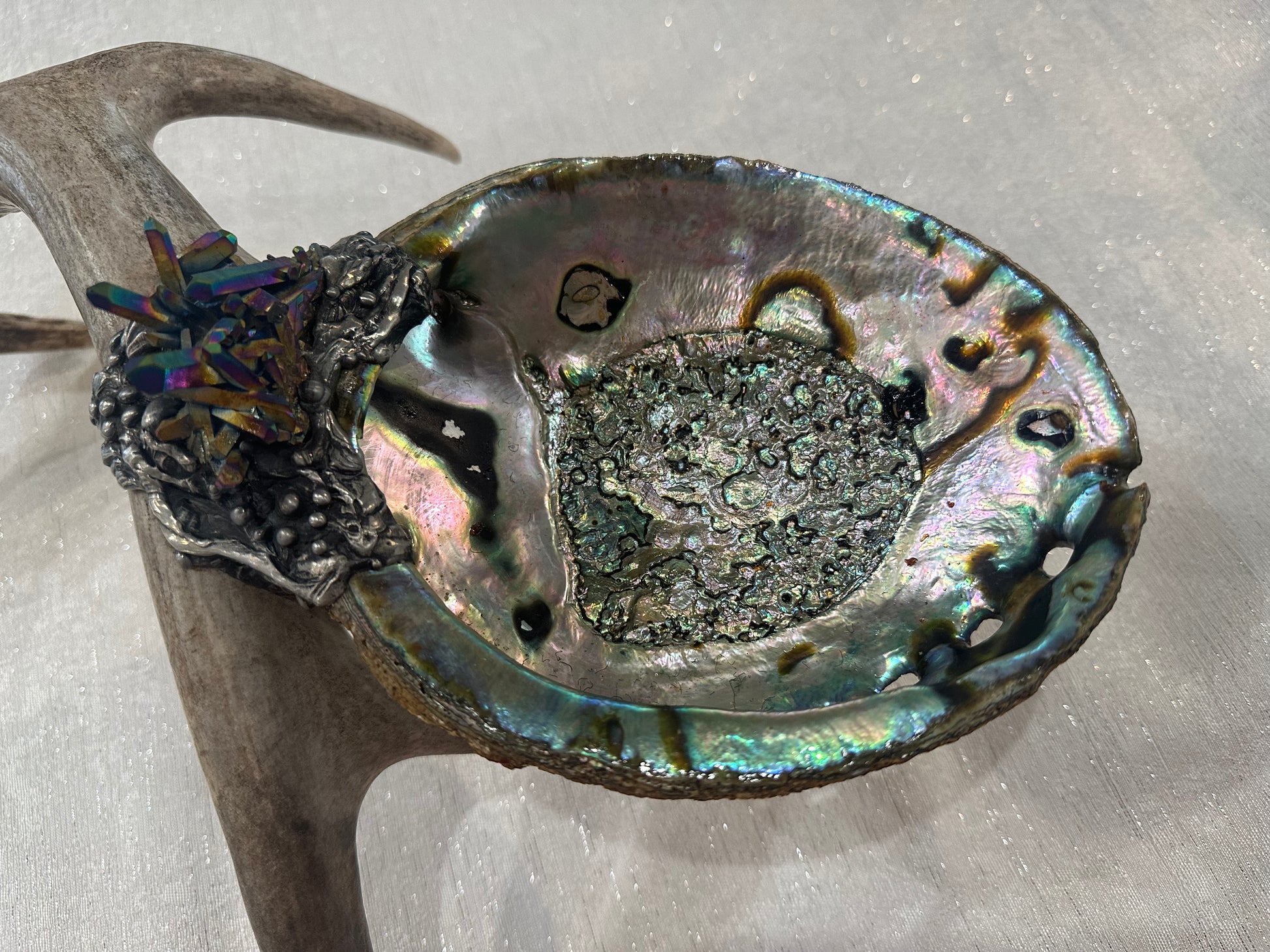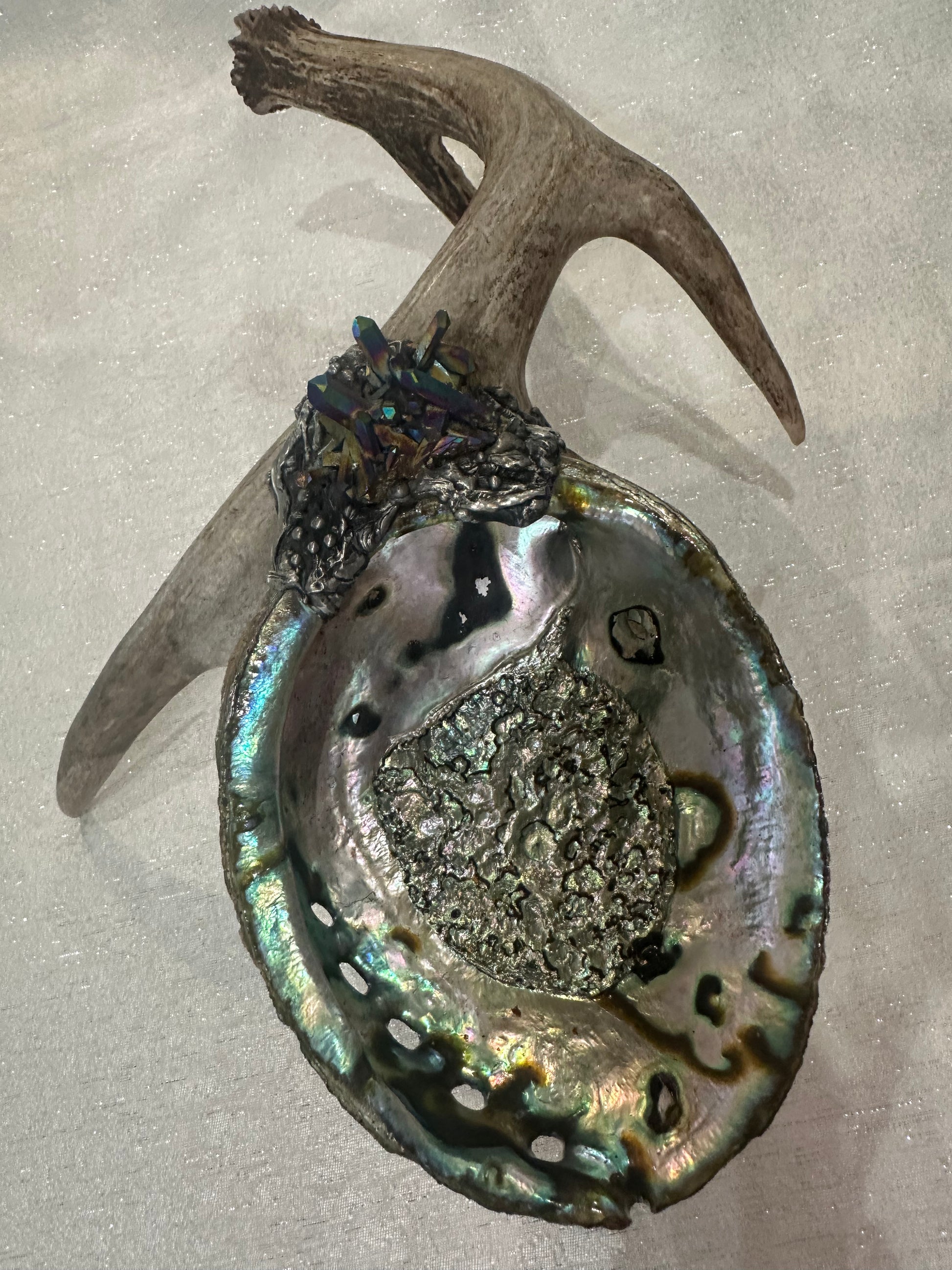 Abalone Shell, silver, deer antler, and Titanium Aura Quarts - Smudge Bowl