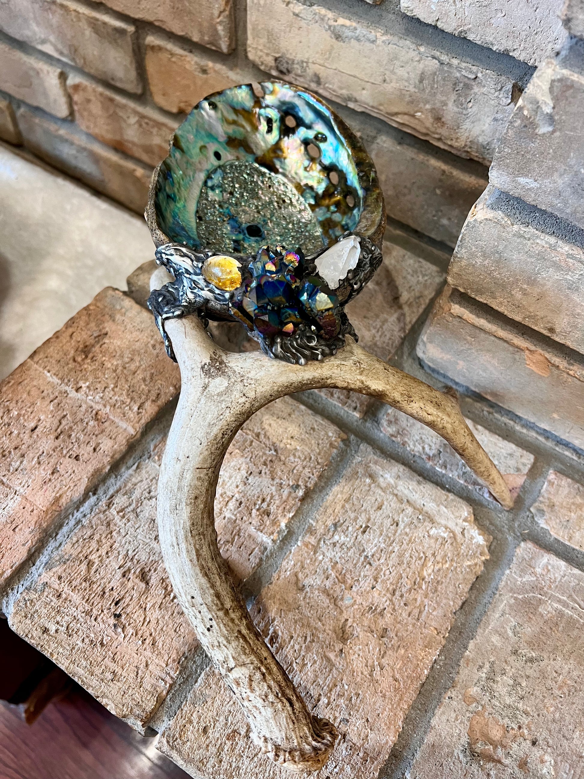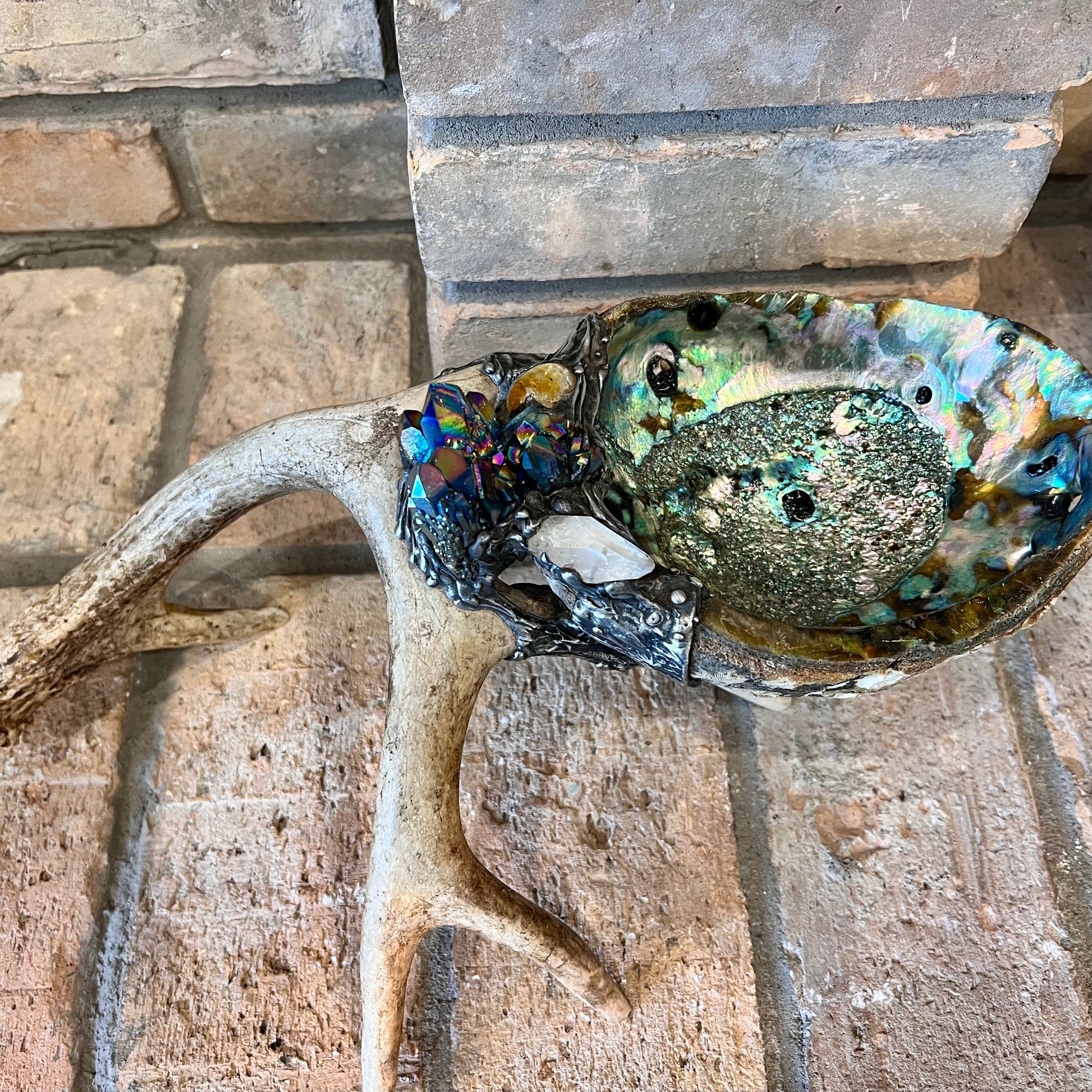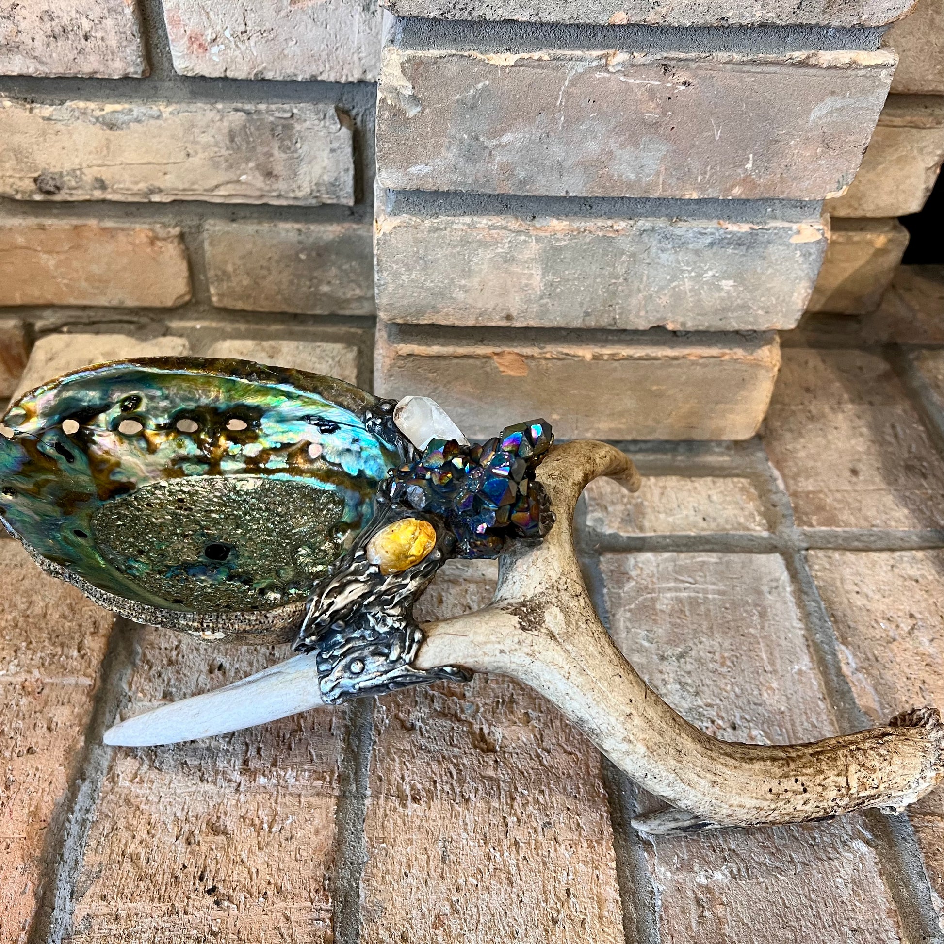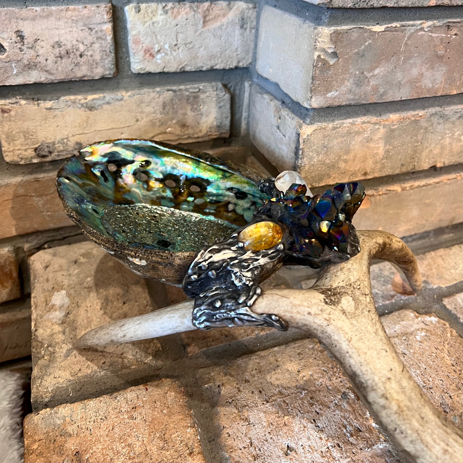 Abalone Shell, silver, deer antler, and Titanium Aura Quarts - Smudge Bowl