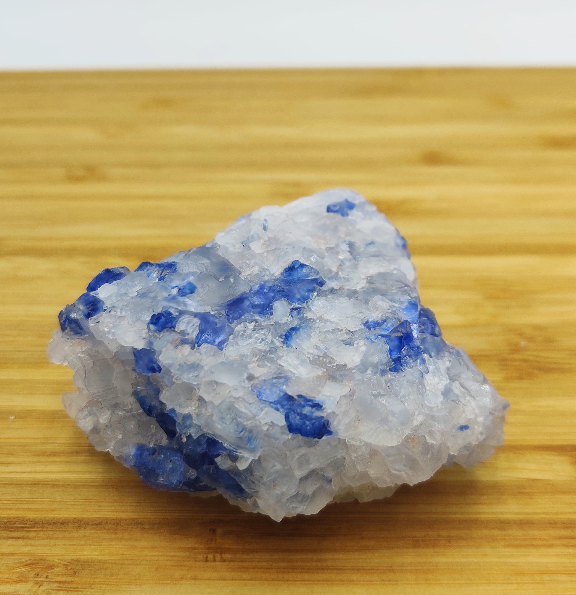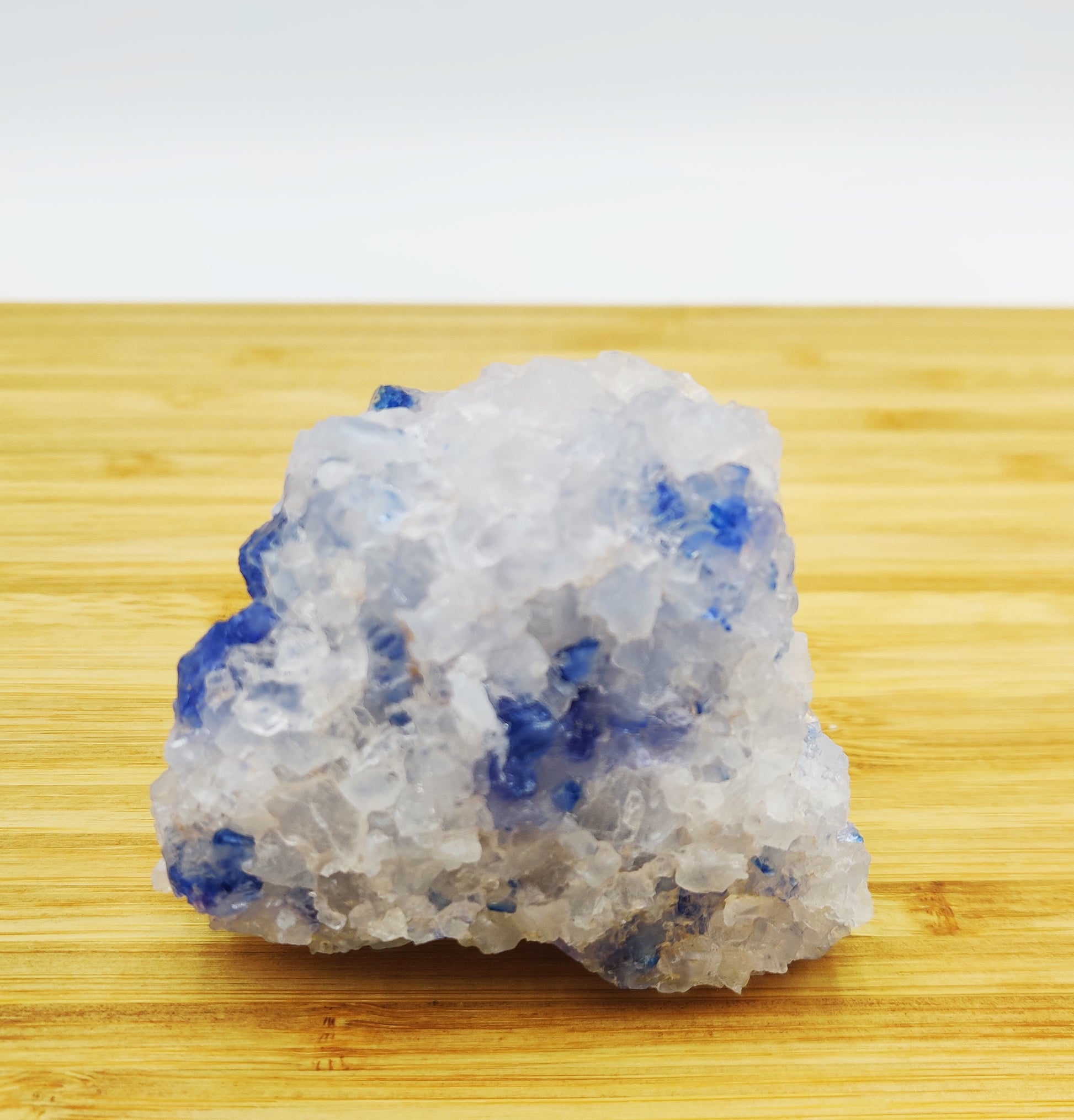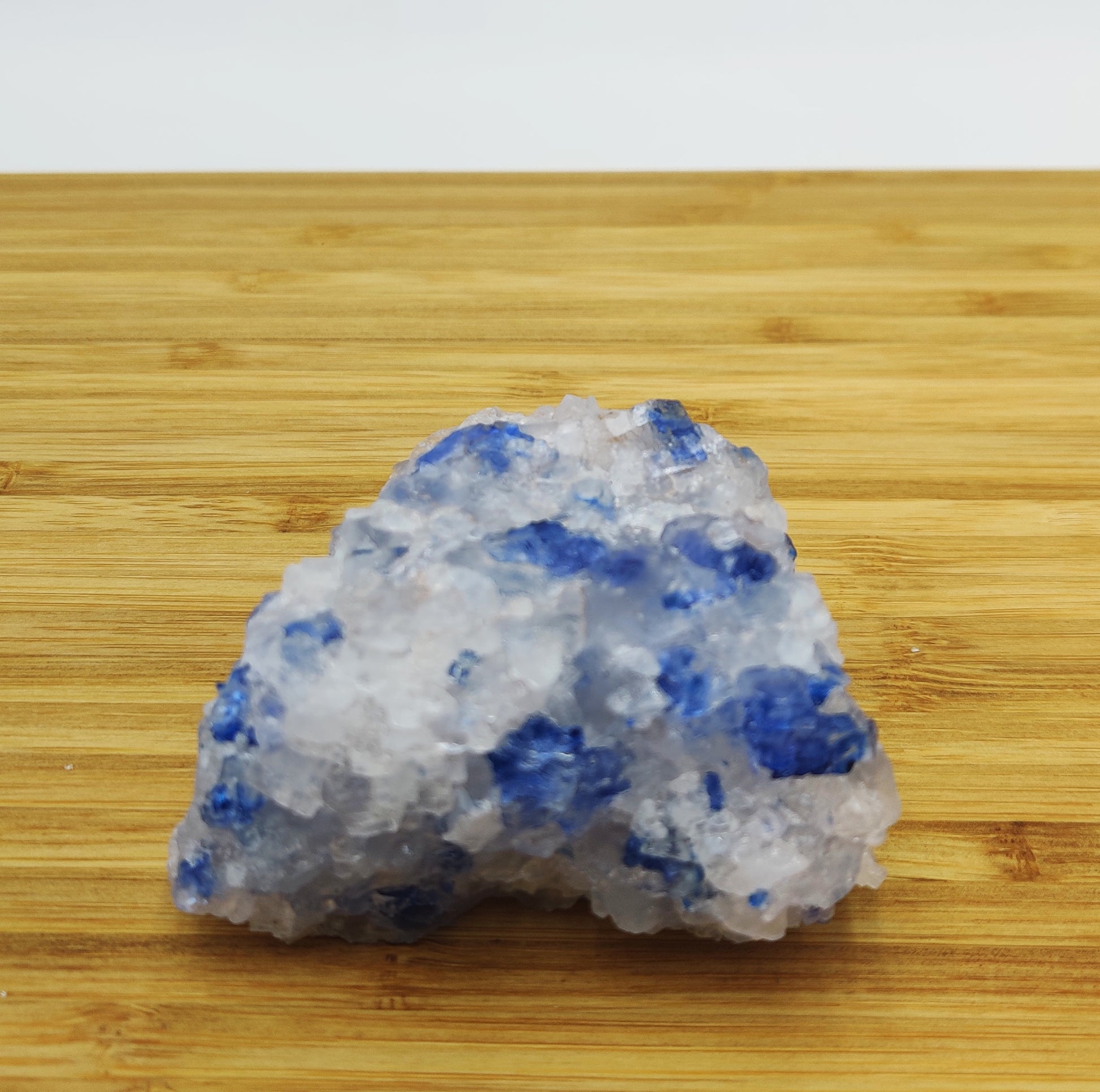 Part of the reason why Blue Halite is hard to come by is due to the matrix in which it forms on. The material is almost always a mineral known as Sylvite, a potassium chloride rock that occurs in dry, evaporite (crystallization through evaporation) areas deep underground. Sylvite’s primary use is as the main ingredient in fertilizers used throughout the world. When extracting this mineral from Earth, countless Blue Halite crystals are found and sadly abandoned or dissolved. All Halites are water-soluble and are usually disintegrated by the time they reach the surface.