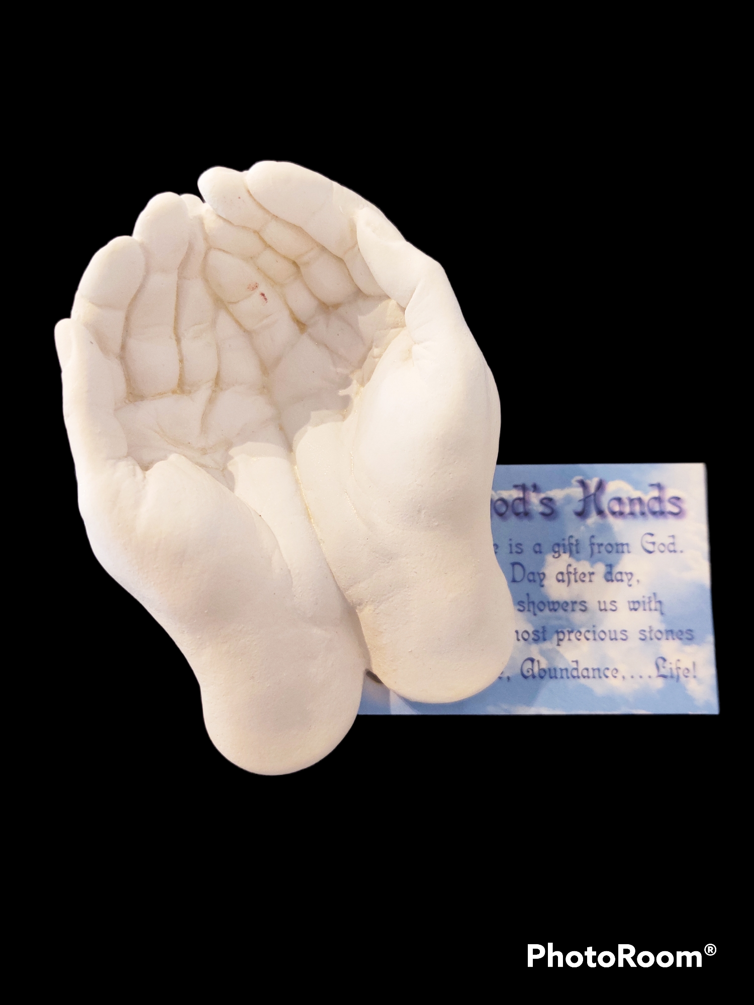 Two strikingly realistic hands are cupped together, in the symbolic offering position. The hands have been crafted from natural gypsum that contains no harmful chemicals. Made in Canada.