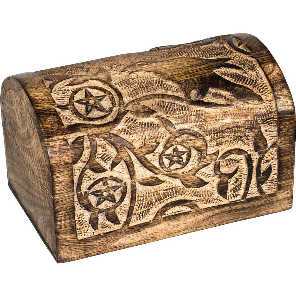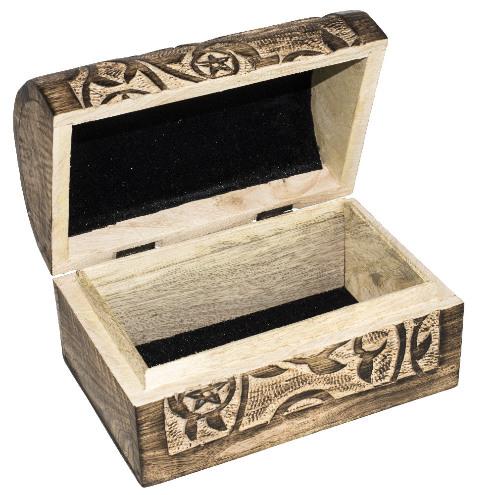 The image of a magical Raven perched among the branches of a pentacle tree has been masterfully carved onto the lid of this delightful treasure chest. Smooth polished sides and a deep rich tone complete the design. This unique chest is great for storing precious stones, crystals or tarot cards. SYMBOL:The raven is often associated with mystery, magic, and wisdom, it is seen as a messenger between realms and a guide through the unknown. The raven represents transformation, change, and the duality of life?both darkness and light. Its appearance is believed to bring messages from the spirit world and profound insights to those who encounter it.SKU:#44297