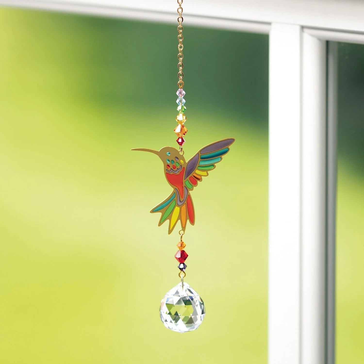 The Crystal Dreams Hummingbird Suncatcher features a stained-glass effect ornament made of gold metal outlines filled with a translucent resin that allows light to shine through it. It is adorned along its chain with genuine Austrian crystals.