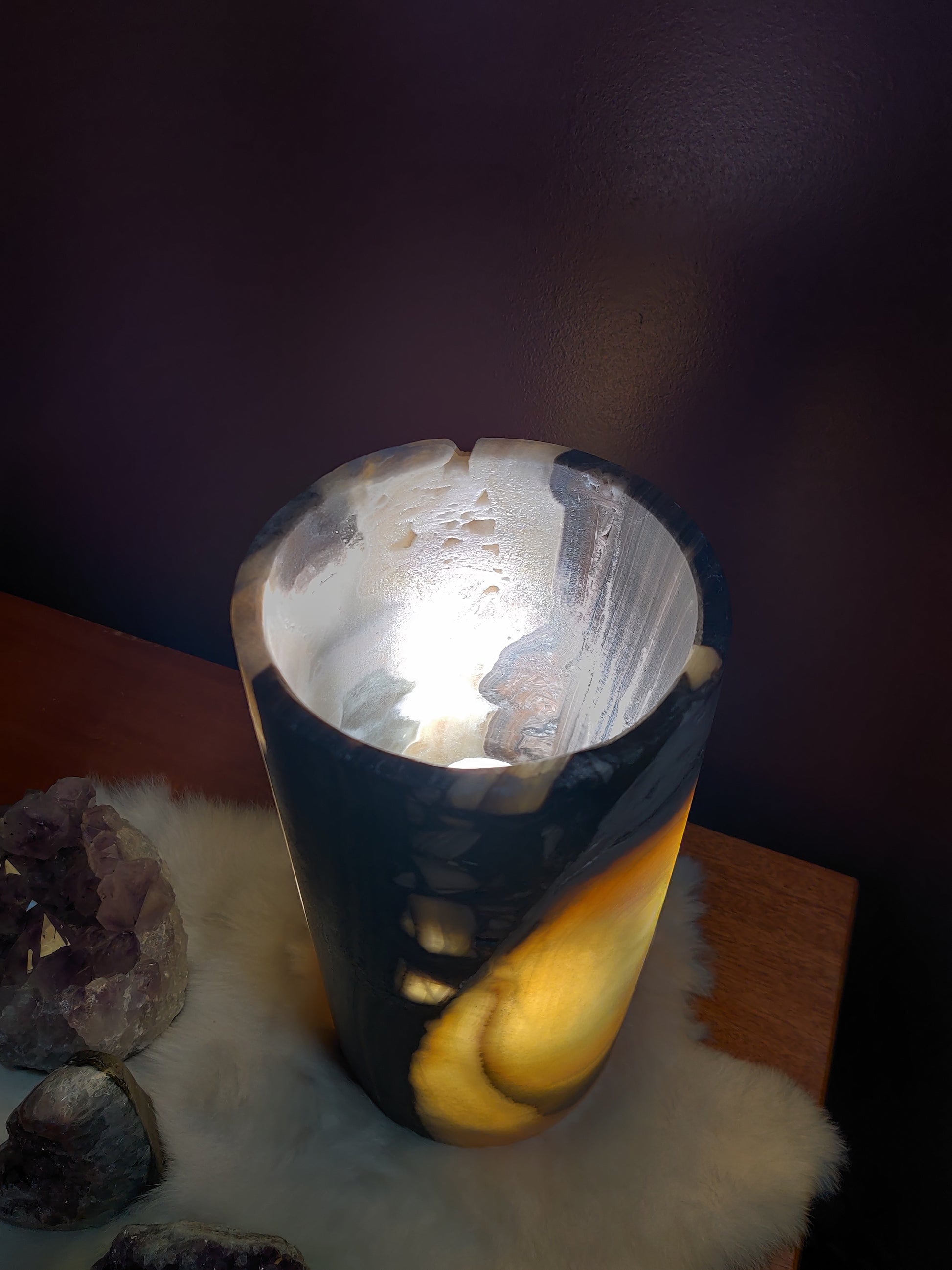 Onyx lamp, banded with shades of dark grey, yellow and white