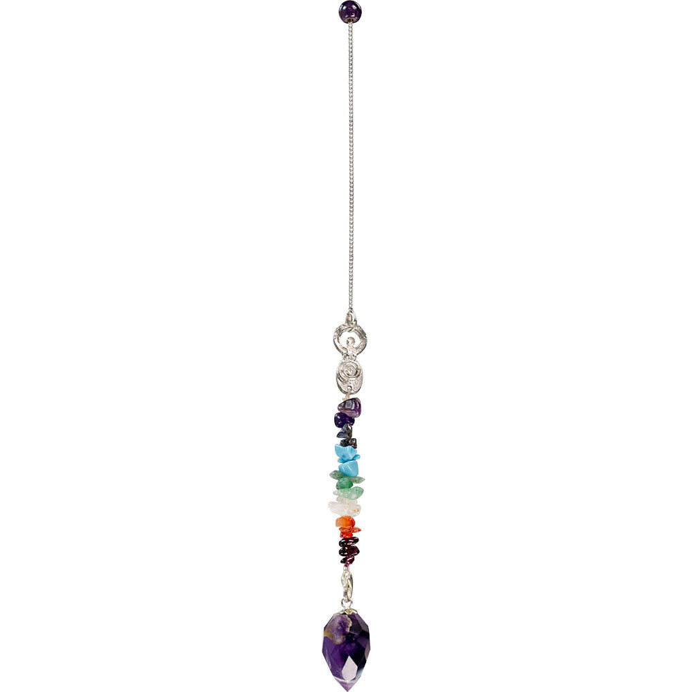 DESCRIPTION: This colorful pendulum is made from Amethyst. The beautiful silvery white metal chain has assorted bands of chip stones, each band representing a chakra and silver toned Goddess. The lobster claw clasp allows the chain to be used as a bracelet with or without the pendulum.