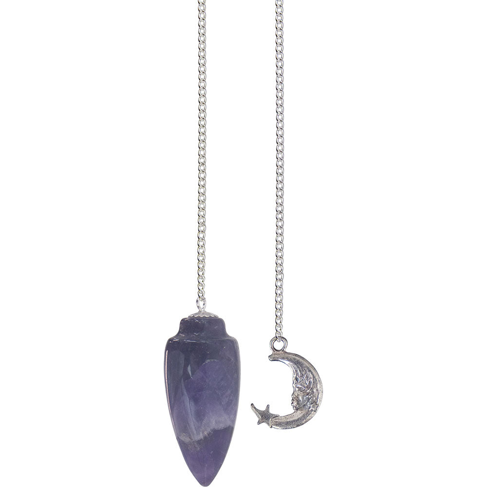 DESCRIPTION: This amethyst pendulum hangs from a silver toned chain which has a moon attached to the end. The moon adds style and beauty and it also ensures the pendulum will not slip between your fingers.