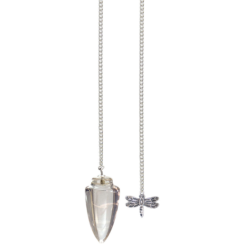 DESCRIPTION: This clear quartz pendulum hangs from a silver toned chain which has a dragonfly attached to the end. The dragonfly adds style and beauty and it also ensures the pendulum will not slip between your fingers.