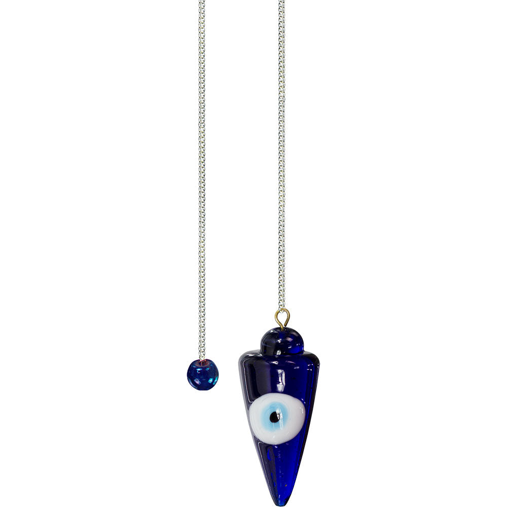 DESCRIPTION: This captivating pendulum is made from cobalt colored glass and features an evil eye bob. The attached chain has a matching cobalt sphere at the end to ensure slip free handling.