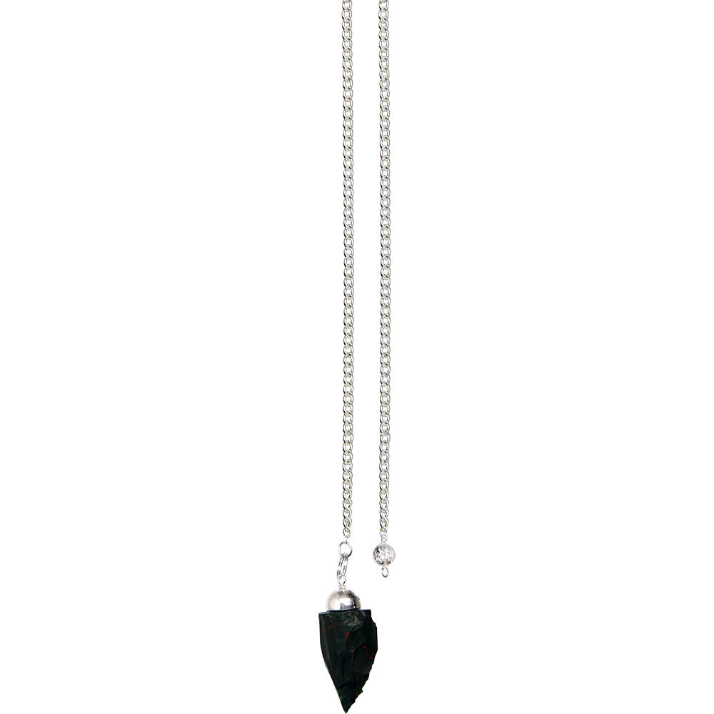 DESCRIPTION: Our rough cut bloodstone pendulum comes on a silvery chain attached to a matching sphere for easy handling. Each pendulum comes with a Beginner’s Pendulum Information Card.