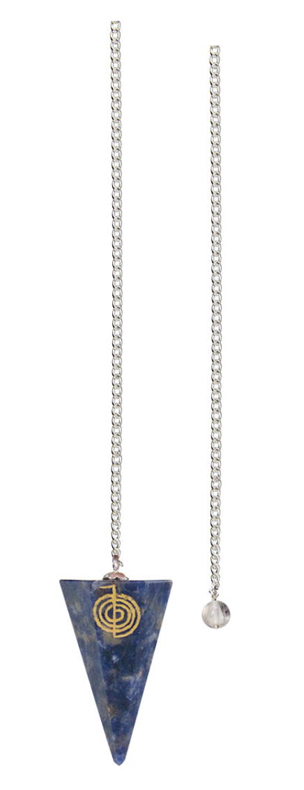 DESCRIPTION: These hexagon shape pendulums are made from sodalite and have been carved with the powerful Cho-Ku-Rei SYMBOL. For added flair the Cho-Ku Rei symbol has been painted gold.