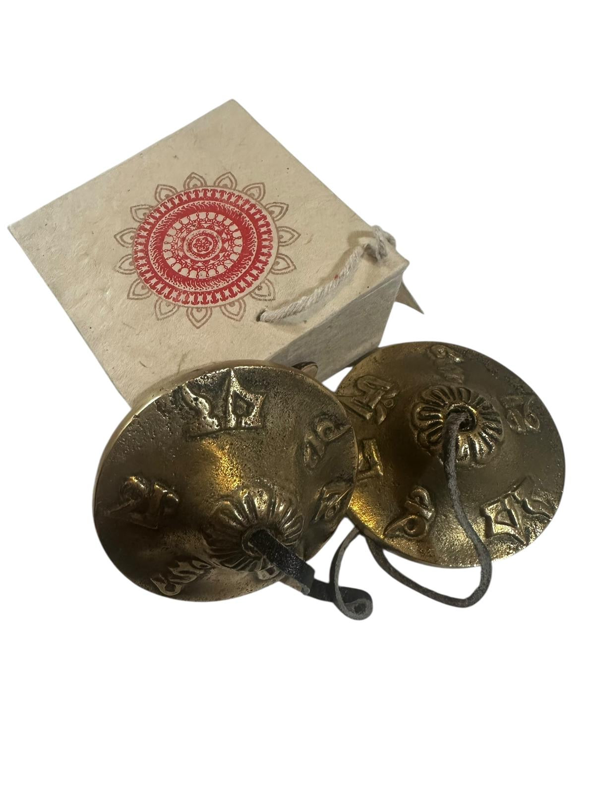 Tingsha bells when struck together, make a pure clean note that awakens the spirit and spreads a sense of peace. They are the perfect way to begin or end a yoga or meditation session. Surrounding the bell are the symbols for om mani padme hum. Each set of tingshas comes in assorted colours that match the attractive gift box. Gift boxes come with assorted symbols.