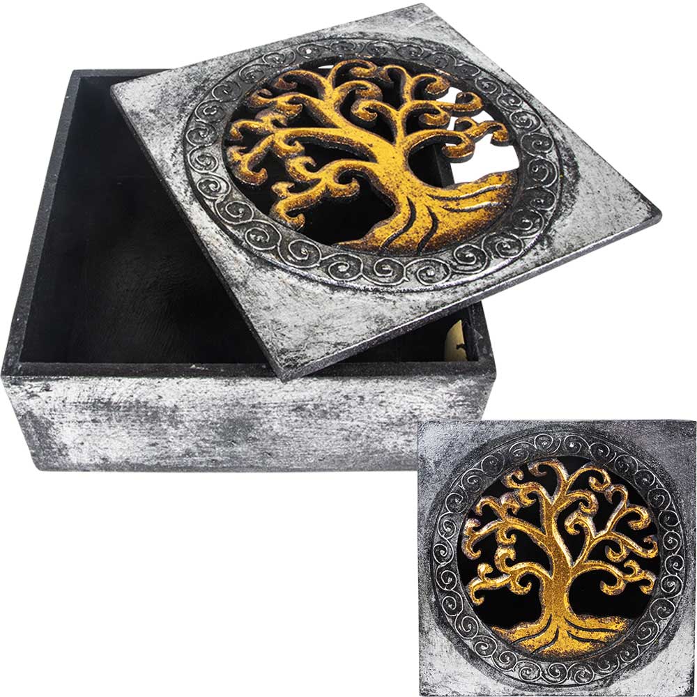 Display keepsakes in this hand-painted 8×8 wooden box carved with a tree of life emblem. Made in Indonesia, this decorative square box features silver and gold painted accents. Ideal for holding jewelry, crystals, tarot cards, and other small objects. SYMBOL: The golden tree with curvy branches symbolizes flourishing potential. Golden hues whisper of prosperity and wisdom, while the tree itself embodies life, strength, and connection. Its graceful, curving branches speak of adaptability, reminding you to embrace life’s twists and turns as you reach for your fullest potential.SKU:#44427