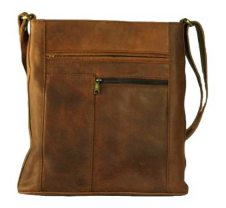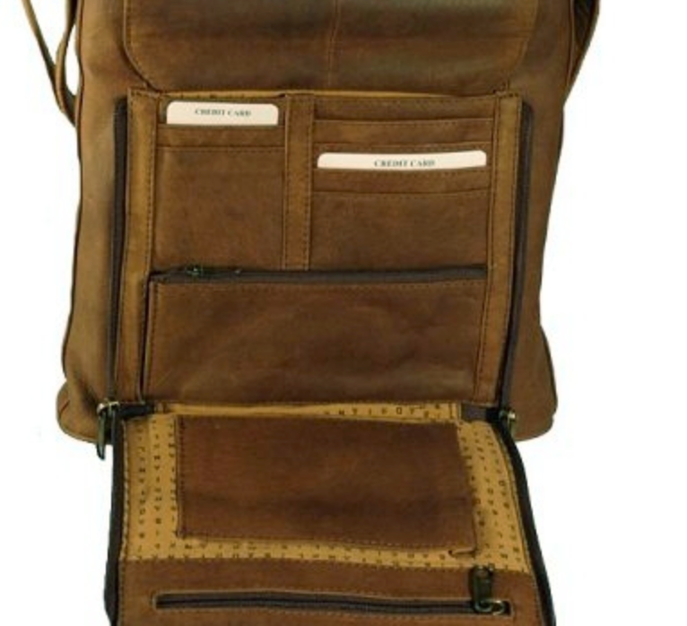 Description: organizer closed with zipper, 1 shoulder strap, 2 zippered components on top with 1 zipper inside, pocket on front with CC and 2 zippers, 2 zippers and 1 pocket on back